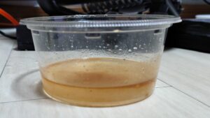 まだまだオイルは減っていませんが、タンク内の水を抜くと油が混じっていたので、こんな感じでオイルが徐々に消費されていき、オイル交換が必要になるんだなと思います。。