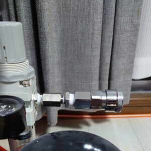 本体に接続されているレギュレーターからは1/8の雄ねじが出ています。エアタンクからの逆流を阻止するため、チェックバルブというものを間に挟み、異形ニップル(1/8→1/4)を付けて1/4のソケットを装着しています。